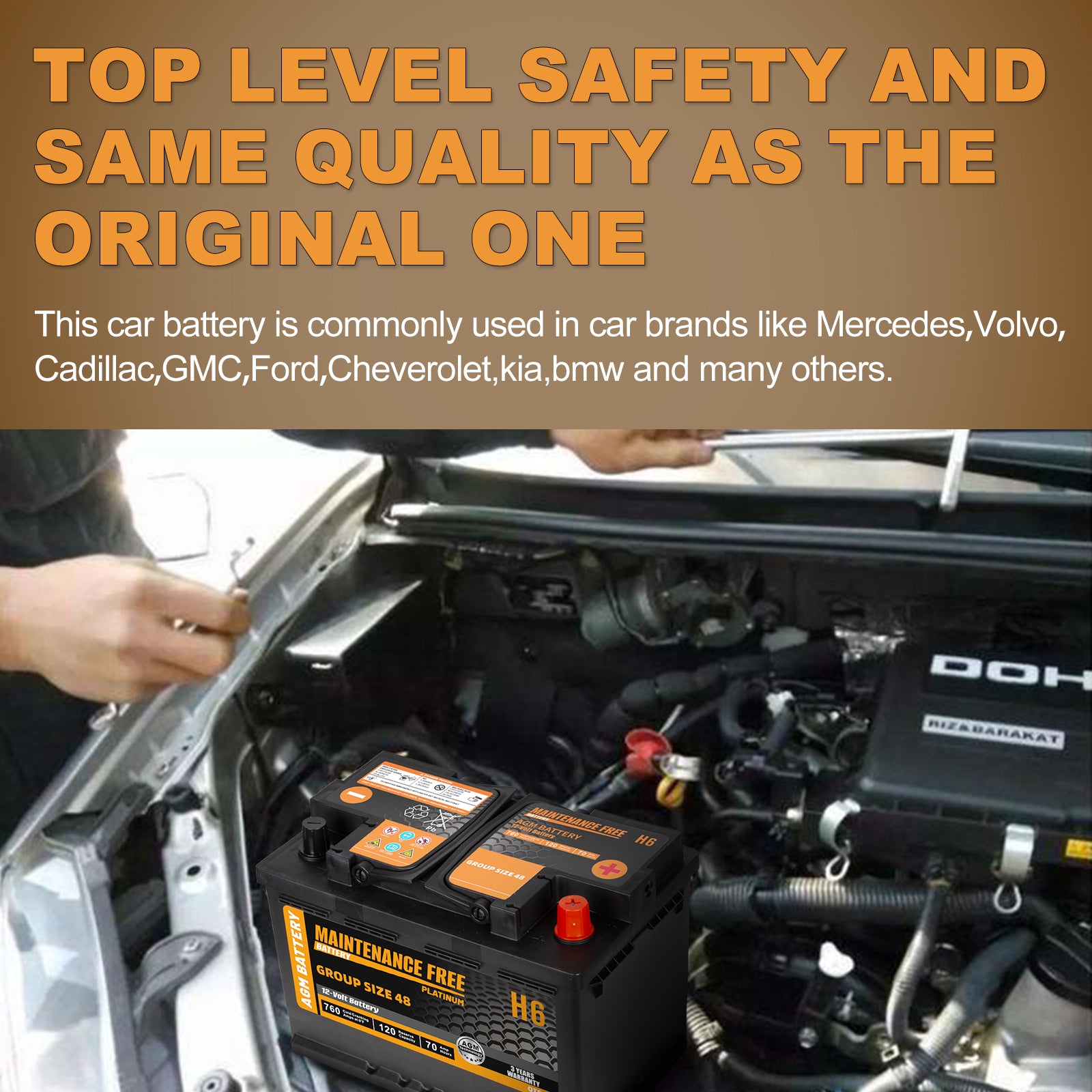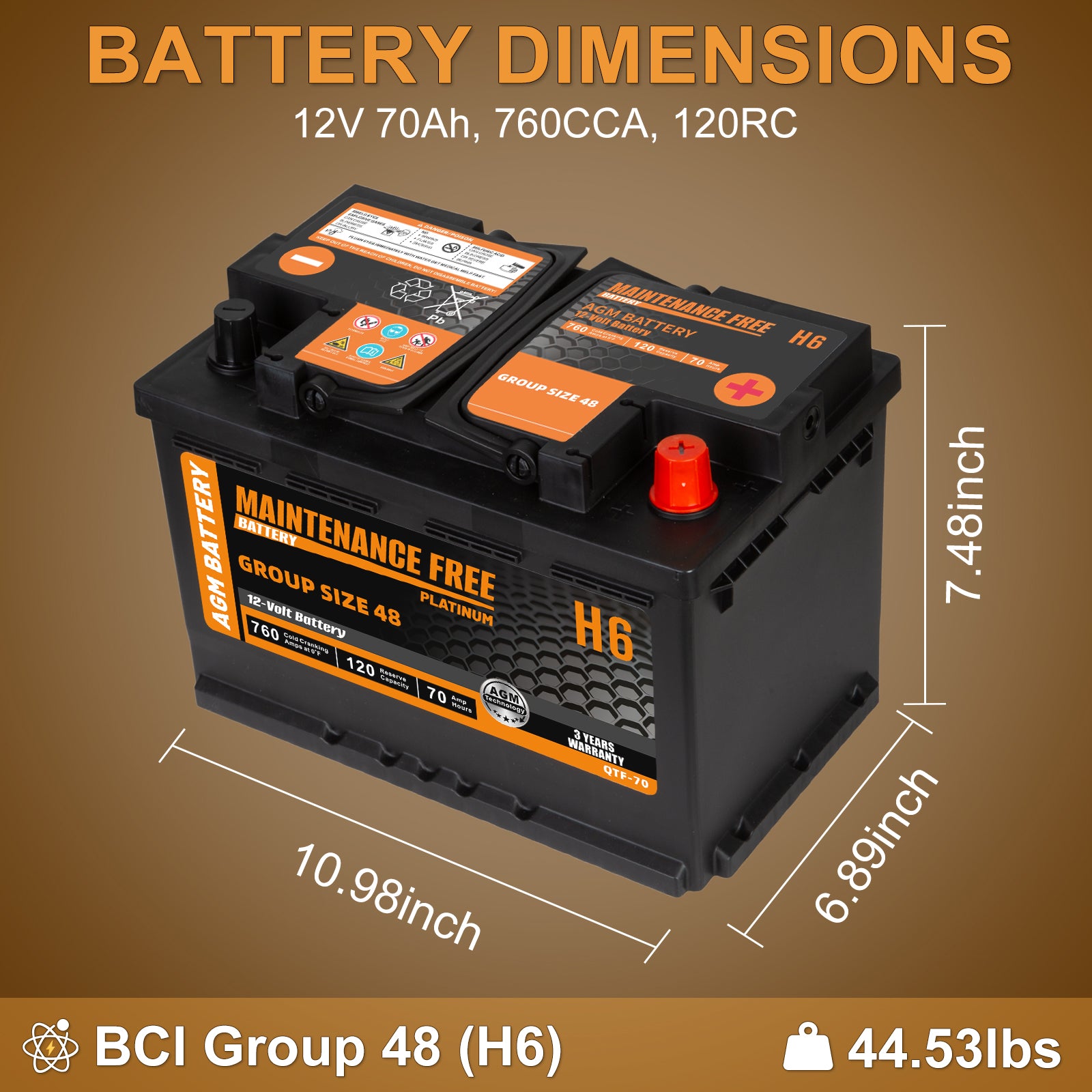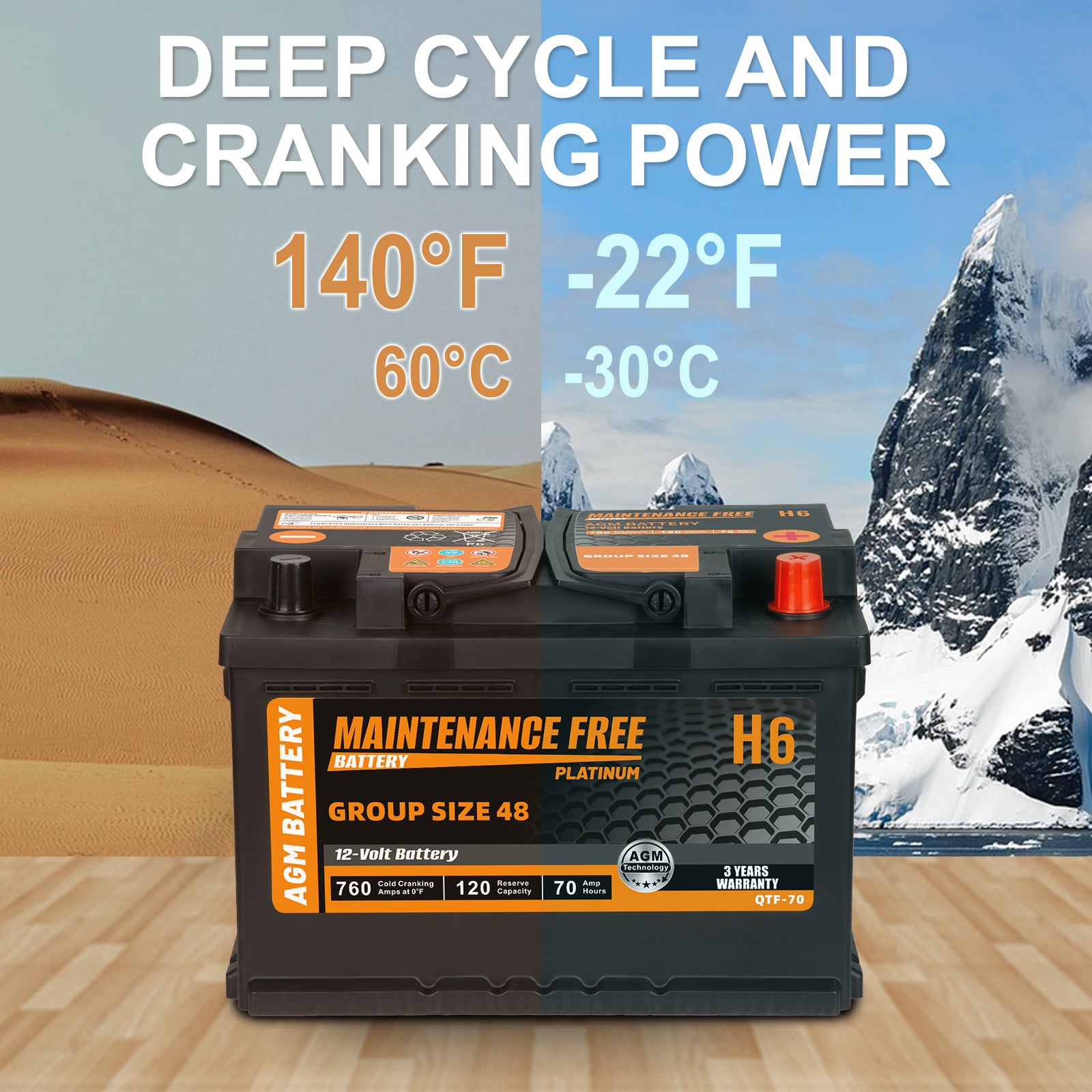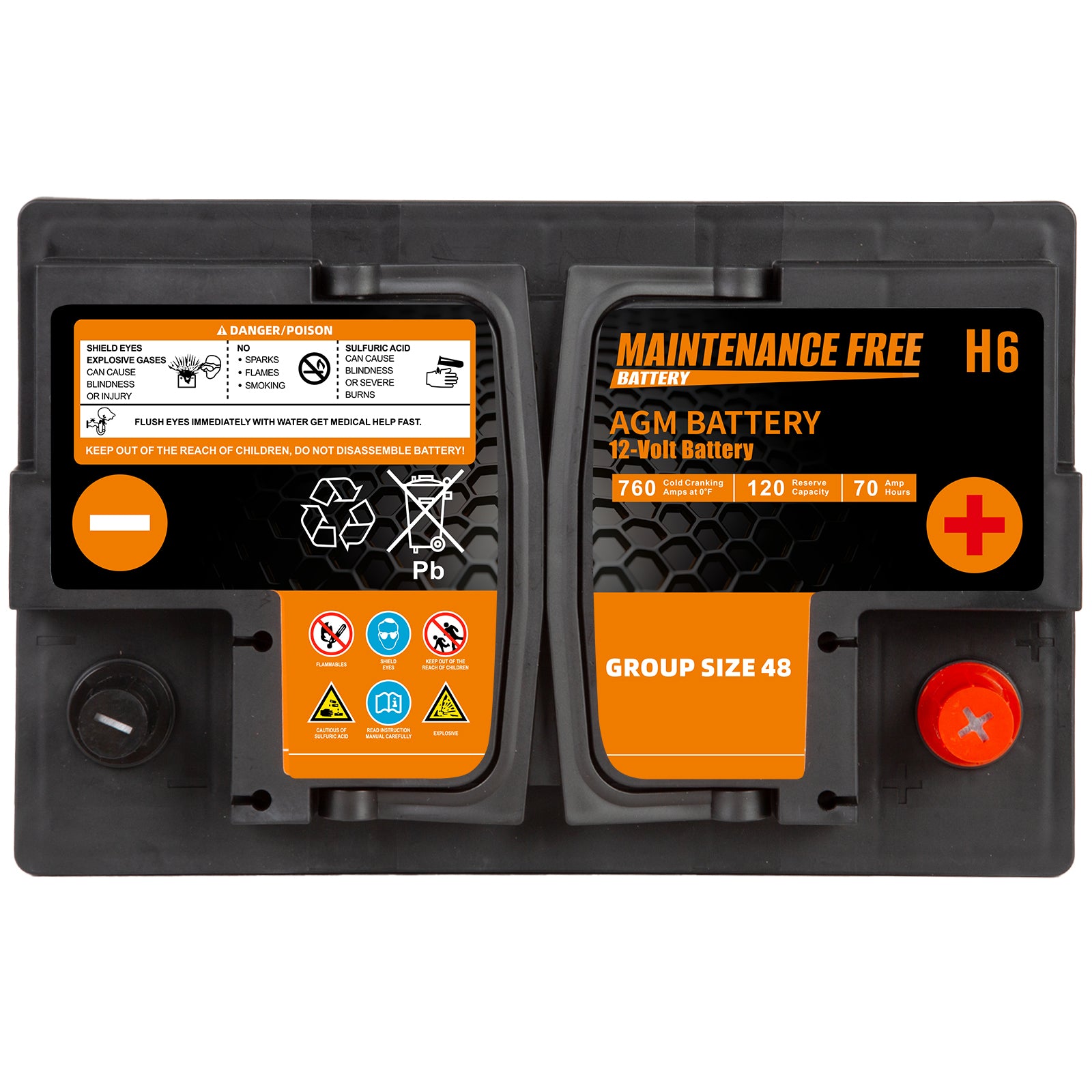 H6 Group Size 48 Start and Stop AGM Automotive Battery, 12V 70Ah, 760 CCA, 120 RC Rechargeable Car Battery