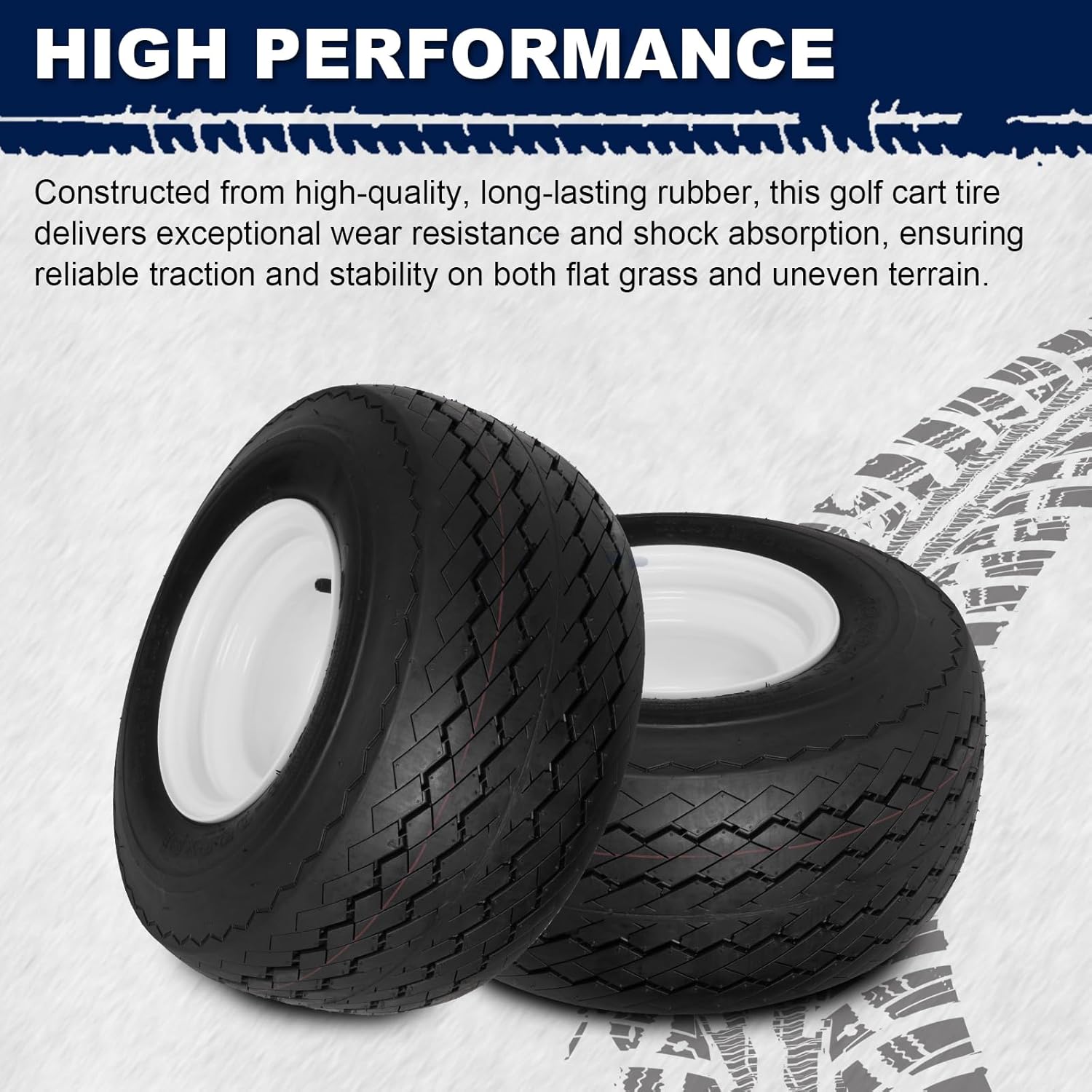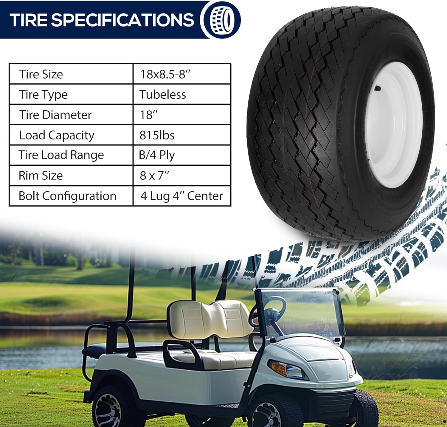 With an 18" overall height and a sleek 8" x 7" white offset wheel, these tires are tailored for golf carts with a standard 4-bolt hub pattern. The balanced design ensures a snug fit and smooth integration with your existing setup.