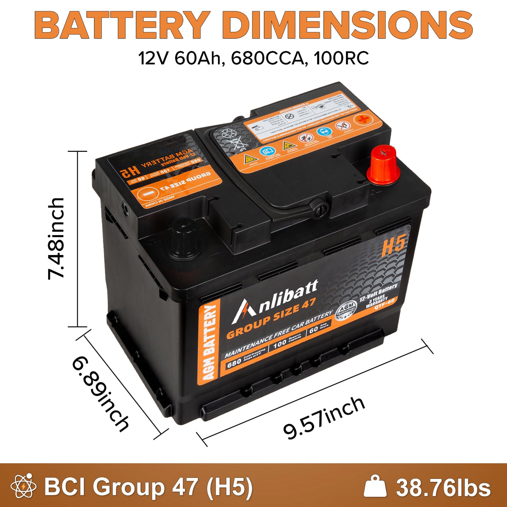 Anlibatt Car Start Stop Battery Group Size 47 H5 680CCA AGM Maintenance Free 12V 60Ah 100RC Rechargeable High Performance Battery