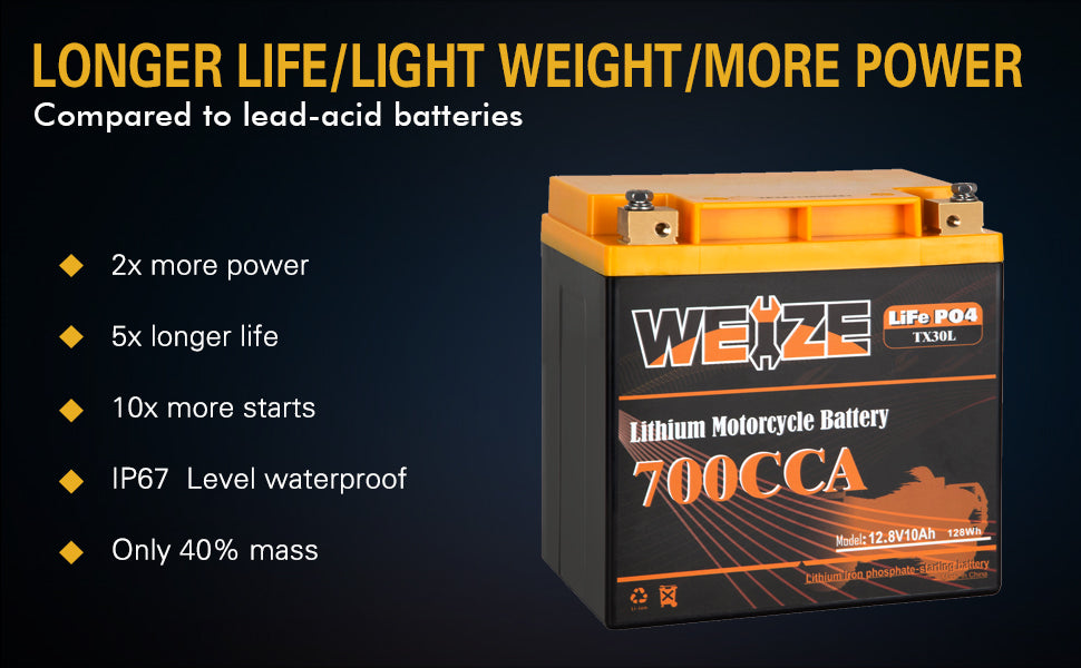 Extended Lifespan: 5x longer life and 20x more cycles than lead-acid batteries, offering long-term cost savings. Lightweight: Weighs only 40% of a comparable lead-acid battery. Powerful Performance: Delivers 500+ amps, 50,000+ starts, and 2,000 charge cycles – 2x more power and 10x more starts than lead-acid. Wide Temperature Range: Operates efficiently in temperatures from -20°C to +60°C. Dynamic BMS for Protection: Features an advanced Battery Management System (BMS) for enhanced protection, performance, and bi-directional cell equalization. IP67 Waterproof: Perfect for motorcycles, ATVs, scooters, UTVs, dirt bikes, snowmobiles, personal watercraft, and lawn mowers, with reliable protection in various environments.