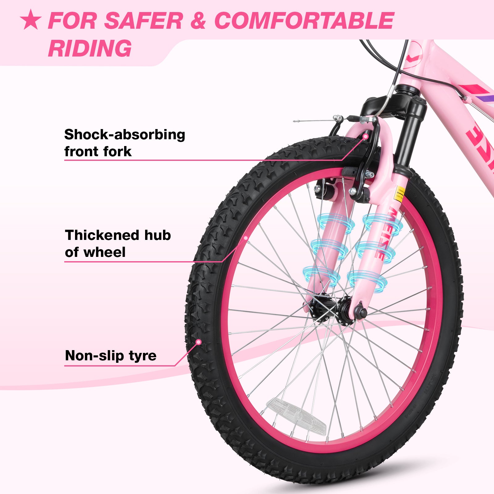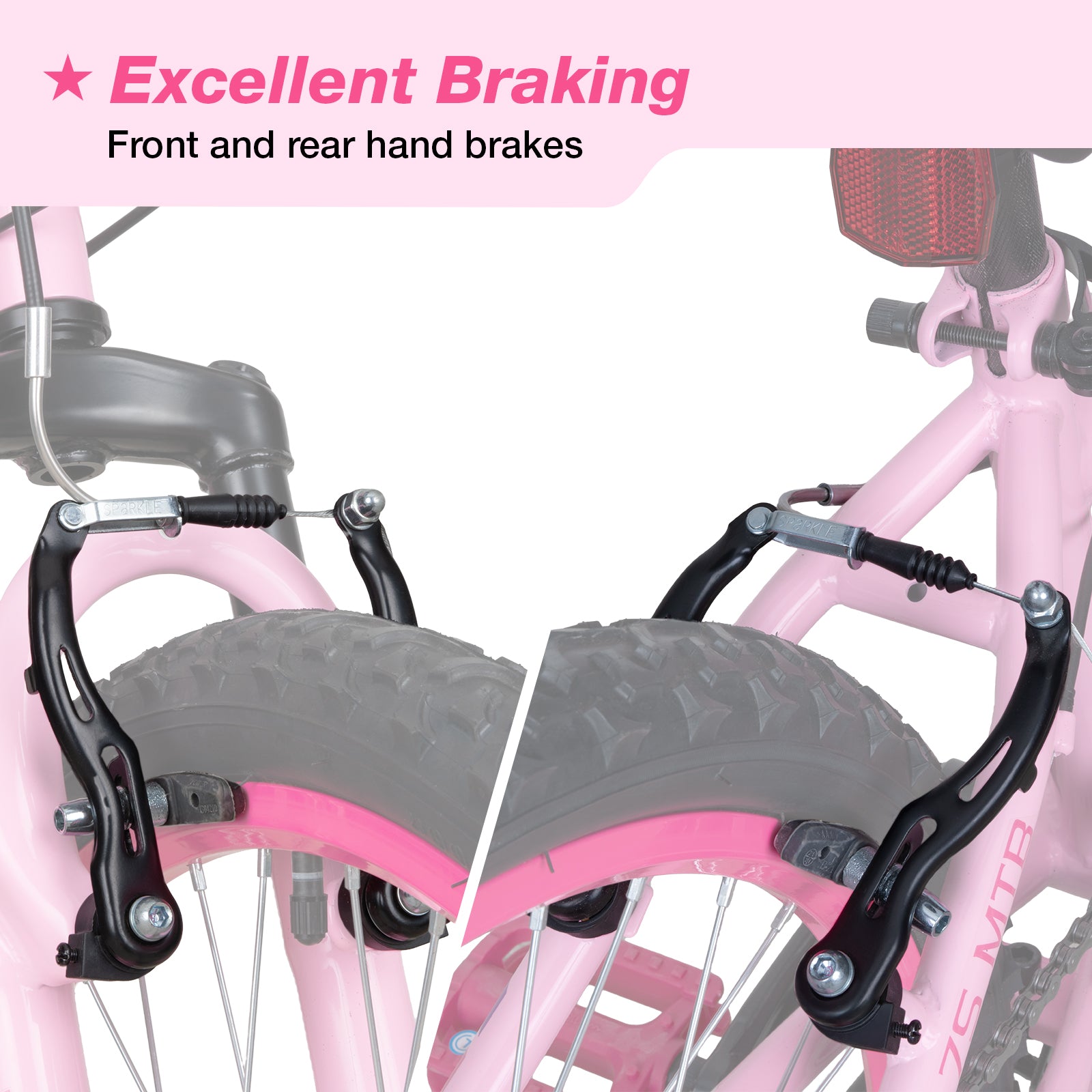 Efficient Braking System Equipped with front and rear caliper brakes, this bike delivers highly responsive and reliable stopping power. Whether on wet surfaces or steep downhill paths, the braking system ensures quick deceleration and control, providing parents peace of mind and safeguarding young riders during their adventures.