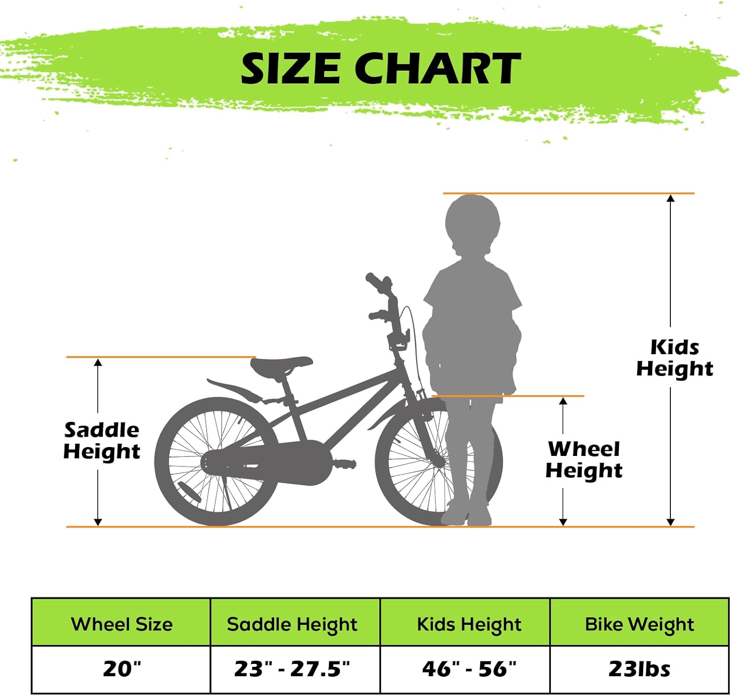 • Scientific Age Matching:We offer boy bikes in two sizes: 16 inches and 20 inches. 16 inches are suitable for 4-6 years old (height 43-49 inches), 20 inches are suitable for 6-12 years old (height 46-56 inches), and there are three color options for bicycles to meet individual preferences.